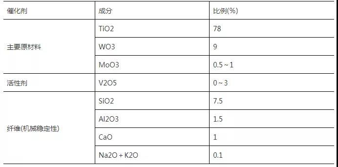 商業(yè)SCR催化劑活性組分為V2O5,載體為銳鈦礦型的TiO2,WO3或MoO3作助催劑。SCR催化劑成分及比例,根據(jù)煙氣中成分含量以及脫硝性能保證值的不同而不同。